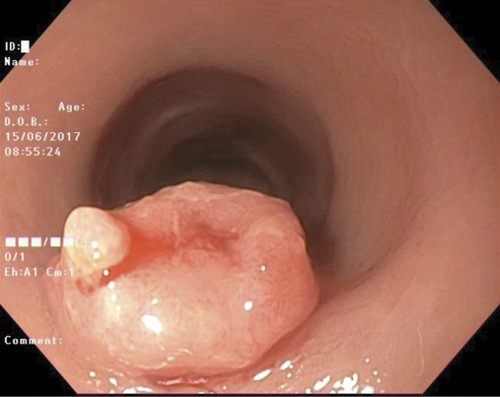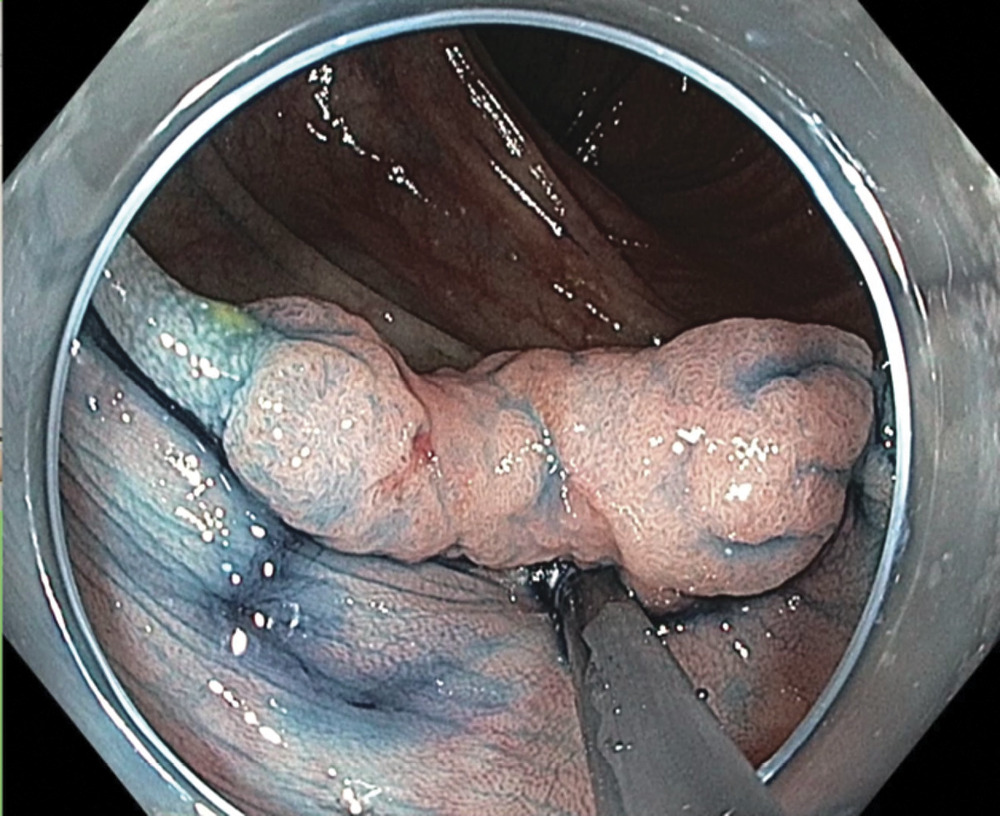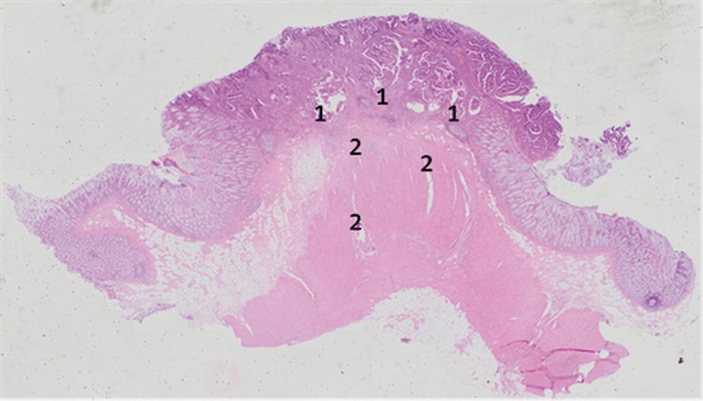 Пациентка К., 59 лет. Диагноз: рак сигмовидной кишки T1N0M0, 1-я стадия, 2-я клиническая группа. При обследовании пациентки в проксимальной части сигмовидной кишки выявлена полиповидная эпителиальная опухоль размером 2,5×2,0 см (рис. 1)