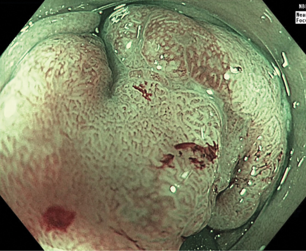 При проведении анализа проф. Ю. Сайто установил, что структура поверхности опухоли имеет тип IV по классификации S. Kudo, что соответствует инвазии только в поверхностный подслизистый слой sm1 (рис. 7).