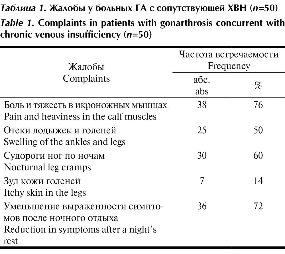 При тщательном ультразвуковом исследовании признаки, характерные для ХВН, были выявлены у 52,1% пациентов. Анализ жалоб у этой категории больных позволил выявить ряд специфических особенностей, характерных для ГА (табл. 1).