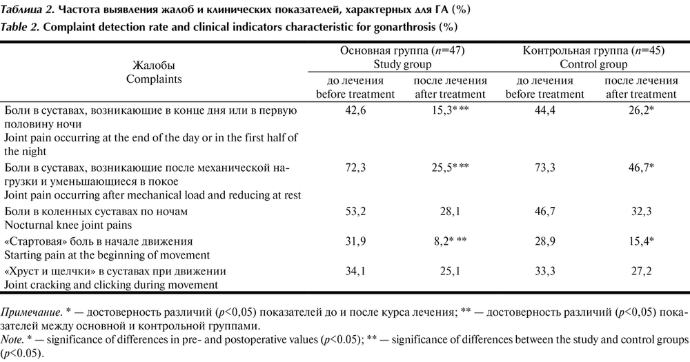 До начала лечения все пациенты предъявляли жалобы на боли в коленных суставах различного характера. Большинство пациентов (72,8%) отмечали боли, появляющиеся после физической нагрузки и уменьшающиеся в покое. У 43,4% обследованных боли в суставах возникали в конце дня или в первую половину ночи, а ½ больных предъявляли жалобы на боли в коленных суставах по ночам. Жалобы на «хруст и щелчки» в суставах при движении озвучили 33,7% пациентов.