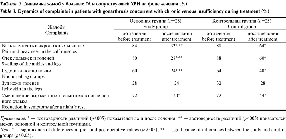 Изучение динамики клинических показателей среди пациентов с сопутствующей венозной недостаточностью нижних конечностей позволило установить достоверное снижение к концу курса лечения в обеих изучаемых группах частоты выявления болей и тяжести в икроножных мышцах, отеков лодыжек и голеней и судорог ног по ночам. Сравнение частоты купирования этих нарушений между группами показало практически двукратное превосходство результатов лечения пациентов основной группы (табл. 3).